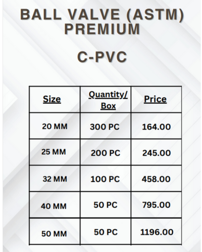 Experience excellence with MKBK India Pvt Ltd's premium ASTM-compliant C-PVC Ball Valves. Engineered for optimal performance, these valves exemplify the company's dedication to crafting high-quality plastic plumbing solutions. The C-PVC material ensures resilience against corrosive elements, making these valves a durable choice for plumbing applications. With a focus on innovation and customer satisfaction, MKBK continues to be a reliable source for top-tier plastic products, contributing to the success of plumbing and construction projects across India.