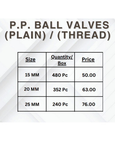 MKBK India Pvt Ltd introduces Polypropylene (P.P) Ball Valves, available in both plain and threaded variants. Designed to meet diverse plumbing requirements, these valves offer versatility and efficiency. The plain and threaded options cater to different installation needs, showcasing MKBK's commitment to providing tailored solutions. With a reputation for high-quality plastic taps and bathroom fittings, MKBK ensures that its P.P Ball Valves uphold the company's standards of durability, innovation, and excellence in the ever-evolving field of plastic sanitary fittings.